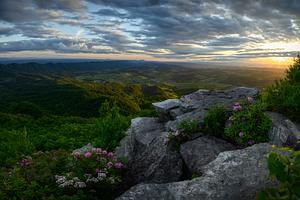 A view from the cliffside at Hidden Valley WMA in Southwest Virginia featuring Catabwa Rhododendron and Mountain laurel in full bloom at sunset.